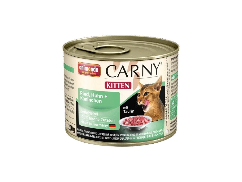 Masová konzerva té nejvyšší kvality pro koťata a mladé kočky (do jednoho roku) z kuřecího a králičího masa. Konzervy Animonda vynikají svou chutí a vyváženým poměrem živin, který zajišťuje zdravý vývoj vašeho koťátka. Čerstvé maso a přísady živočišného původu zaručují lahodnou chuť krmiva, kterou kočky tolik milují, a zároveň obsahuje všechno, co váš mazlíček potřebuje ke svému růstu a správnému vývinu. V konzervě naleznete viditelné menší šťavnaté kousky masa, ideální velikosti pro koťátka, naopak v ní nenajdete přidaný cukr, obilí ani sóju. S přídavkem taurinu a uhličitanu vápenatého pro zdravé kosti, zuby, dásně a oběhový systém. Přirozený zdroj chloridu sodného pro správnou funkci organismu.
