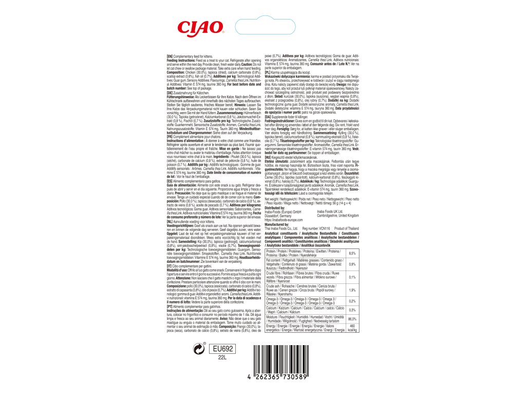 Pokyny pro krmení: Dávejte své kočce jako pamlsek. Po otevření uchovávejte v lednici a podávejte do druhého dne. Denně poskytujte čistou a čerstvou vodu. Doplňkové krmivo pro kočky. Upozornění: Nenechte kočku žvýkat obalový materiál a dbejte, aby jej nespolkla. Při krmení rukou buďte obzvláště opatrní.