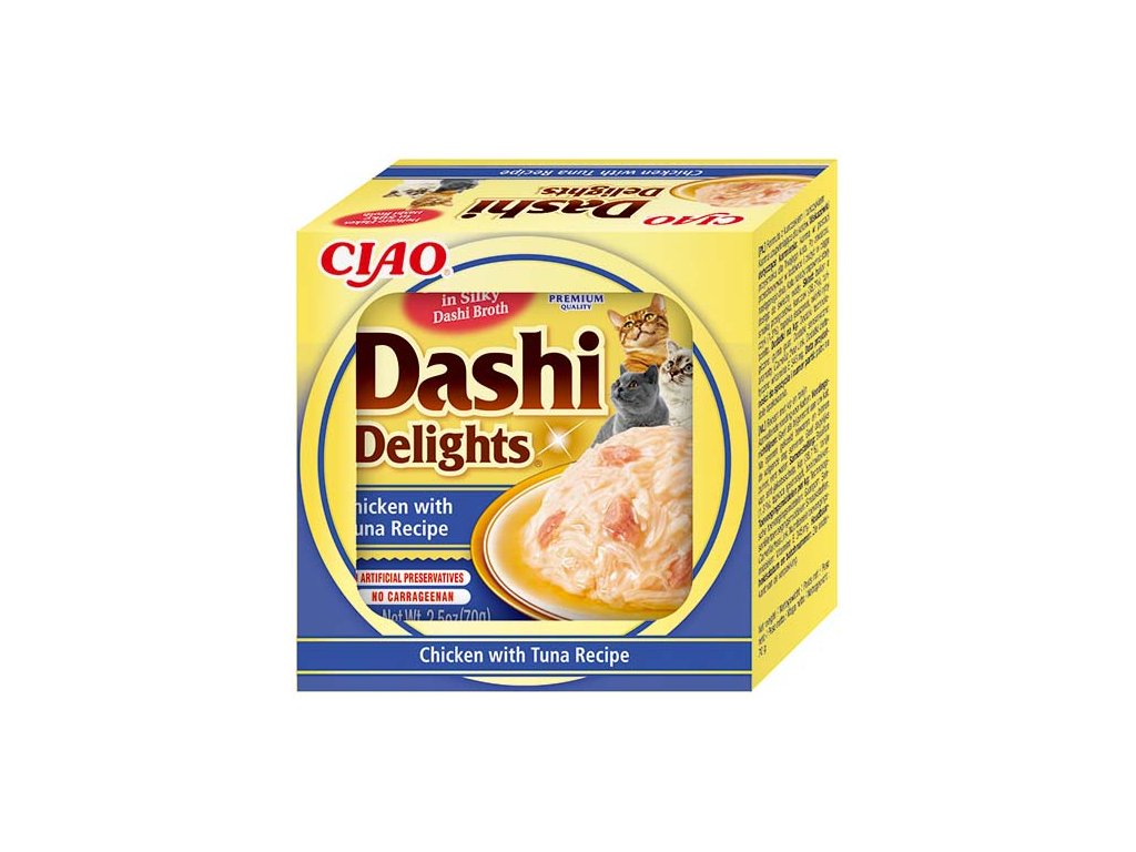 Kuřecí maso a jemné tuňákové vločky v lahodném vývaru Dashi. Dashi je tradiční japonský rybí vývar z tuňákových vloček, který je známý svou vyjímečnou, lahodnou chutí. Zařazení Dashi do jídelníčku vaší kočky může dodat krmení nový rozměr a učinit ho vyjímečným zážitkem. Nejde jen o chuť - dashi může poskytnout i důležité živiny včetně vitaminů a minerálů. Dashi má nízký obsah kalorií a tuku, takže je zdravým doplňkem stravy vaší kočky. Je to produkt na bázi vývaru, což znamená, že obsahuje vysoké množství vody a tím pomáhá udržet zdraví vaší kočky. Dashi se může stát chutným a výživným doplňkem stravy vaší kočky, který si díky její neodolatelné chuti určitě zamiluje. Všechny produkty Inaba jsou vždy bez obilovin, zbytečných ingrediencí a pochybných přísad a jsou vyrobené z pravého mořského tuňáka a kuřat chovaných na farmách.