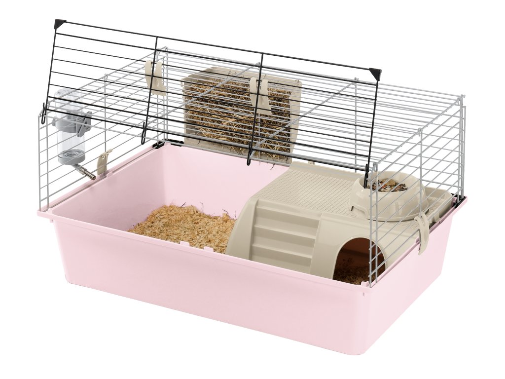 Klec CAVIE 15 je vyrobena ze zdravotně nezávadného plastu a drátů ošetřených odolným lakem. Obsahuje patro, které zvířátku slouží i jako domeček. Má misku, která se dá na patro upevnit, napáječku a jesličky na seno.
