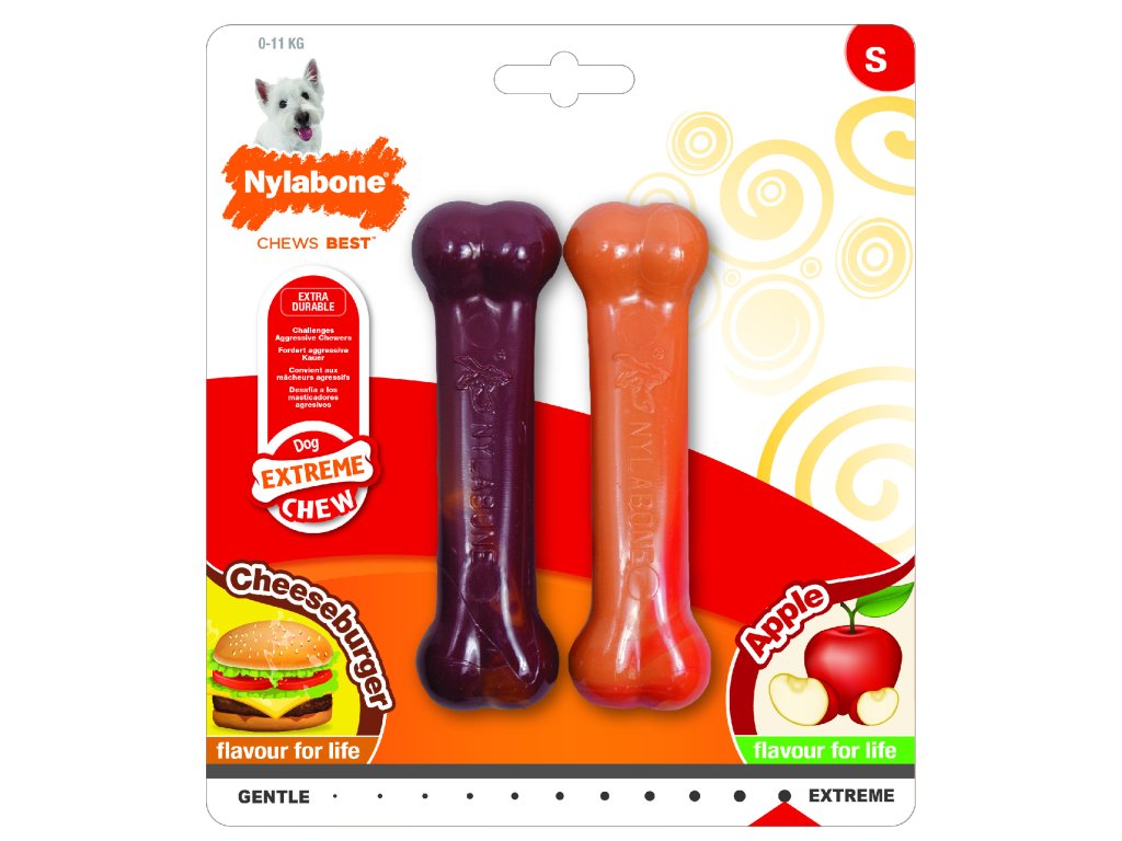 Hračky Extreme Chew jsou navrženy pro psy se silným skusem. Pomáhají čistit zuby a redukují tvorbu plaku a zubního kamene během žvýkání. Uspokojují přirozenou potřebu žvýkání a navíc řeší problém s agresivním kousáním. Žvýkací hračku si váš pes brzy oblíbí mimo jiné díky lahodné příchuti cheeseburgeru a jablka.