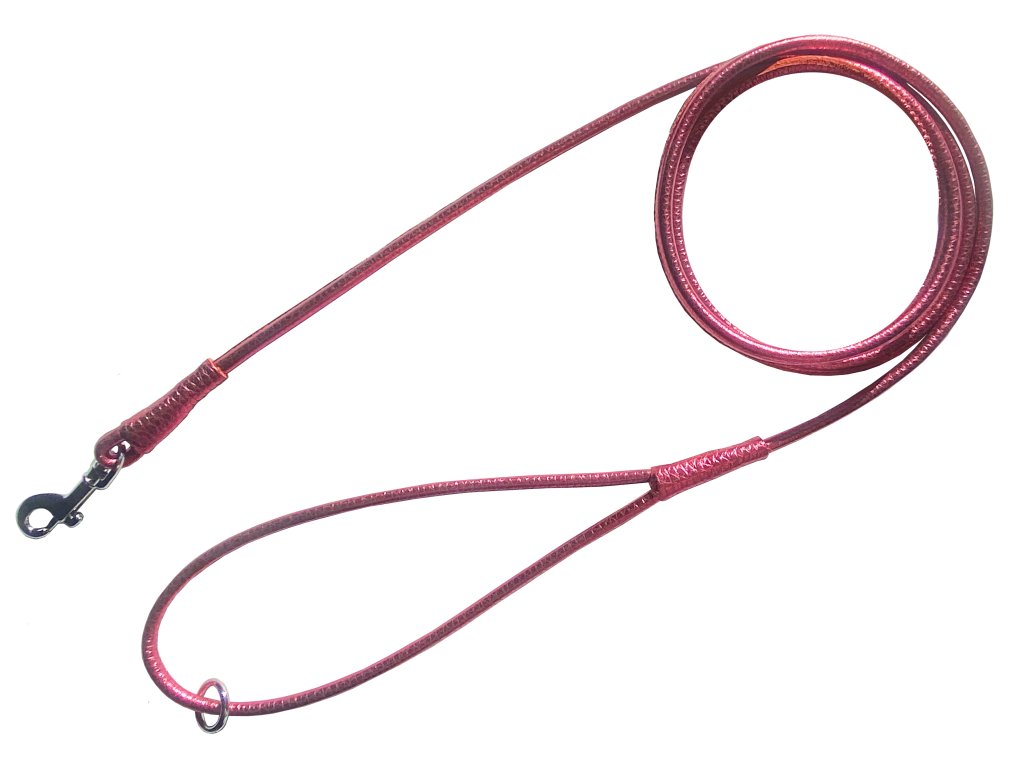 Vodítko z italské hovězí kůže metalickým efektem. Vodítko je kulaté a po celé délce prošité. V uchu je umístěný kroužek pro připnutí taštičky na pytlíky. Vodítko disponuje také hákovou kovovou karabinou na připínání k obojku. Celková délka 140 cm s průměrem 5 mm. Vyrobeno v České republice. Barva: růžová.