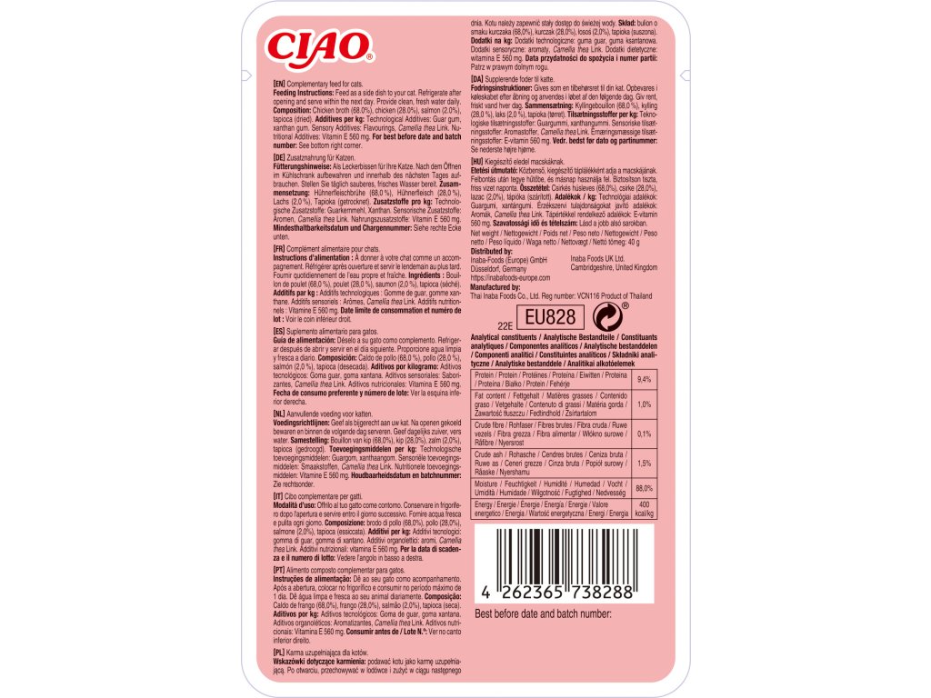 Složení: Maso a výrobky živočišného původu (kuřecí vývar 68 %, kuřecí 28 %, losos 2 %), tapioka (sušená)