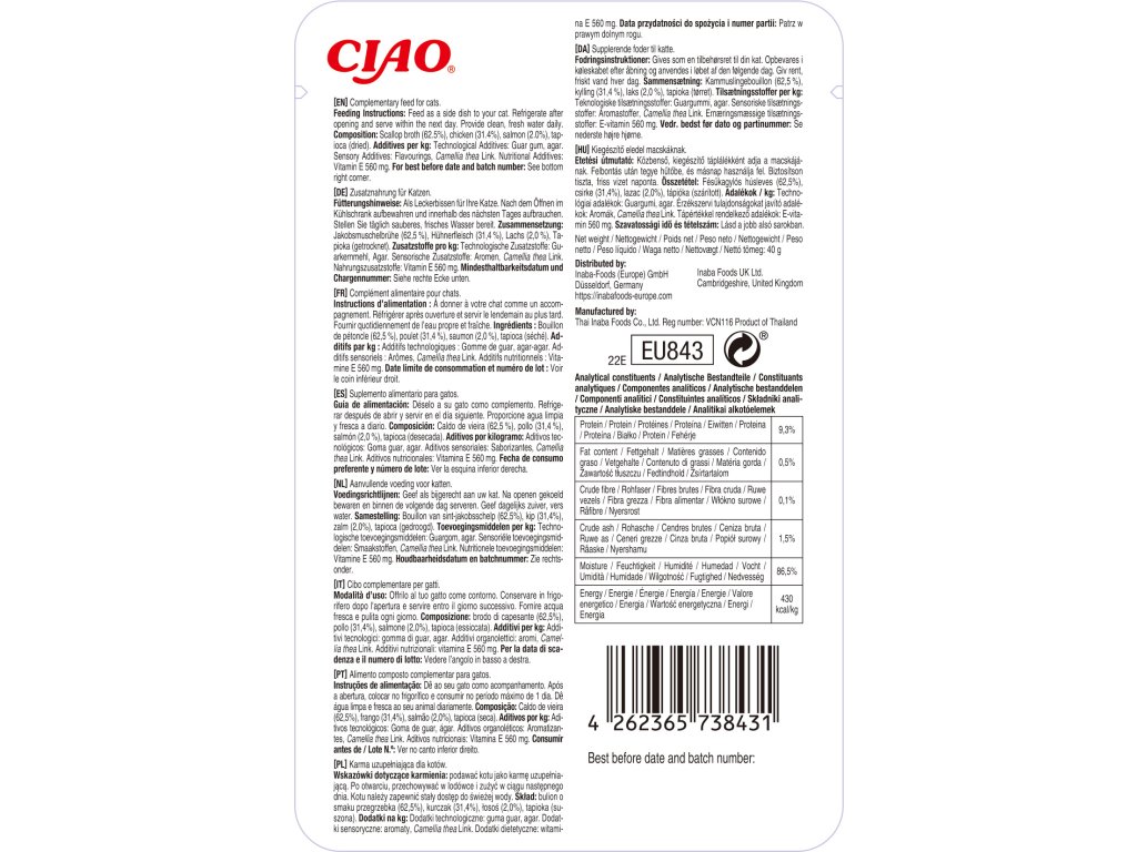 Složení: Maso a výrobky živočišného původu (vývar z hřebenatek 62,5 %, kuřecí 31,4 %, losos 2 %), tapioka (sušená)