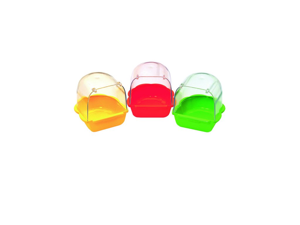 Praktická koupelna pro malé ptáčky (andulky, zebřičky, kanárky) se dá snadno zavěsit na klec i položit na její dno. Díky pravidelné koupeli se papouškovi zregeneruje jeho peří a zachová si svůj lesk. Koupelna má hezké barvy a celkově je vyrobena tak, aby působila v kleci designově.