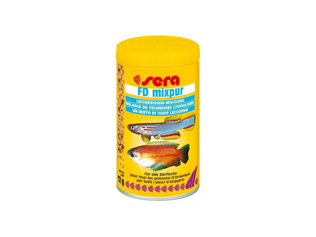 Sera FD Mixpur je chutná "Müsli" směs pro téměř všechny druhy ryb. Vyvážená směs lyofilizovaných (vakuově sušené mrazem) červených komářích larev, nítěnek, žábronožky solné, krilu a dafnie. Díky šetrnému zpracování surovin jsou zachovány hodnotné živiny. Ideální odměna mezi jídly pro společenská akvária, plná ryb různé velikostí a rozličných chutí. Na rozdíl od mražených krmiv neobsahuje parazity a choroboplodné zárodky.