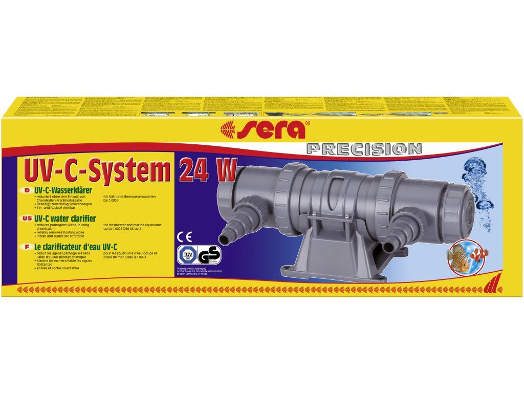 Výkonný UV-C systém od společnosti Sera je skutečný všeuměl, neboť se dá použít jak ve sladkovodním či mořském akváriu, tak i v jezírku. Je přitom bez ohledu na místo použití zvlášť výkonný a zajišťuje po dlouhou dobu čistou, nezakalenou vodu – samozřejmě bez vedlejších účinků na zvířata a rostliny. Tento čisticí systém využívá vytvářené UV záření, aby zničil patogeny jako bakterie, viry a plísně a také řasy a parazity. Tak se zkvalitní životní podmínky pro obyvatele vašeho akvária či jezírka a jejich zdraví se viditelně zlepší. Zvlášť praktický je otočný univerzální adaptér, který umožňuje flexibilní připojení čtyř různých průměrů hadic a skutečnost, že vstupní a výstupní otvor se nacházejí na stejné straně, tím se šetří místo při instalaci. I výměna účinné, úsporné PL-UV-C žárovky probíhá snadno a stačí k ní několik málo úkonů. Díky bílé vnitřní stěně přístroje odolného vůči UV záření se záření odráží, což ještě zvyšuje účinnost. Funguje následovně: Voda se čerpá čerpadlem do vnitřního prostoru UV-C systému, kde protéká okolo žárovky vydávající UV-C záření, která je chráněna vysoce kvalitním křemičitým sklem. Toto krátkodobé ozáření vody stačí ke zničení veškerých nežádoucích složek a tak zajišťuje čistou vodu, která na druhé straně opět vytéká z přístroje.