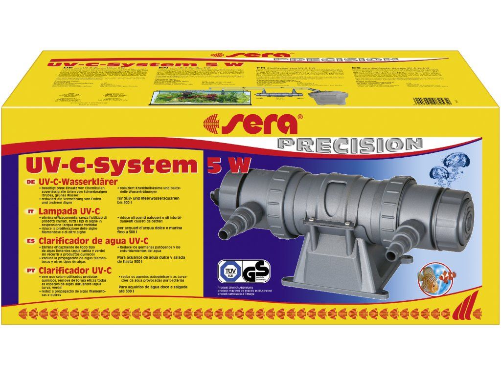 Výkonný UV-C systém od společnosti Sera je skutečný všeuměl, neboť se dá použít jak ve sladkovodním či mořském akváriu, tak i v jezírku. Je přitom bez ohledu na místo použití zvlášť výkonný a zajišťuje po dlouhou dobu čistou, nezakalenou vodu – samozřejmě bez vedlejších účinků na zvířata a rostliny. Tento čisticí systém využívá vytvářené UV záření, aby zničil patogeny jako bakterie, viry a plísně a také řasy a parazity. Tak se zkvalitní životní podmínky pro obyvatele vašeho akvária či jezírka a jejich zdraví se viditelně zlepší. Zvlášť praktický je otočný univerzální adaptér, který umožňuje flexibilní připojení čtyř různých průměrů hadic a skutečnost, že vstupní a výstupní otvor se nacházejí na stejné straně, tím se šetří místo při instalaci. I výměna účinné, úsporné PL-UV-C žárovky probíhá snadno a stačí k ní několik málo úkonů. Díky bílé vnitřní stěně přístroje odolného vůči UV záření se záření odráží, což ještě zvyšuje účinnost. Funguje následovně: Voda se čerpá čerpadlem do vnitřního prostoru UV-C systému, kde protéká okolo žárovky vydávající UV-C záření, která je chráněna vysoce kvalitním křemičitým sklem. Toto krátkodobé ozáření vody stačí ke zničení veškerých nežádoucích složek a tak zajišťuje čistou vodu, která na druhé straně opět vytéká z přístroje.
